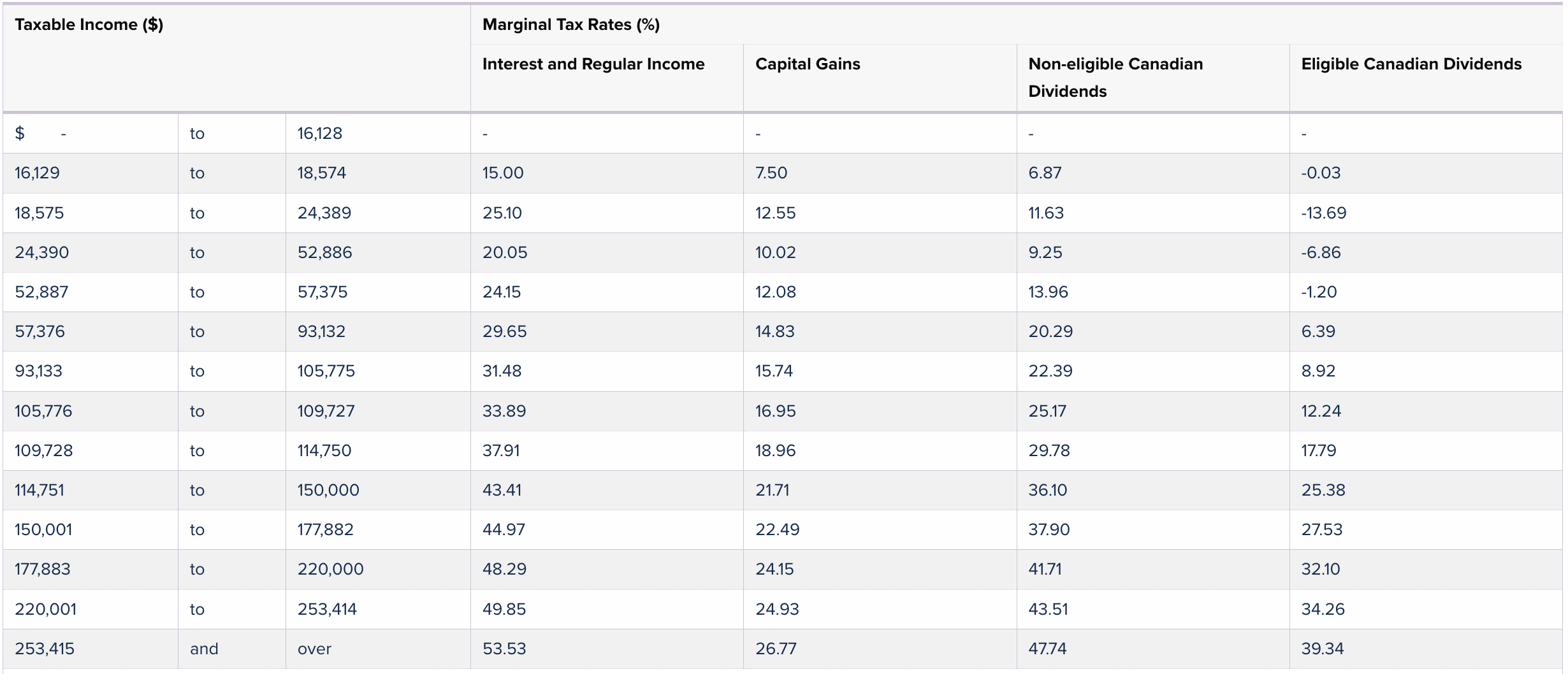 *Rates do not include the Ontario Health Premium. Not applicable for use if the taxpayer is subject to Alternative Minimum Tax (AMT) provisions. Rates pertaining to dividends apply to the actual amount of taxable dividends received from Canadian corporations, not the gross-up amount.